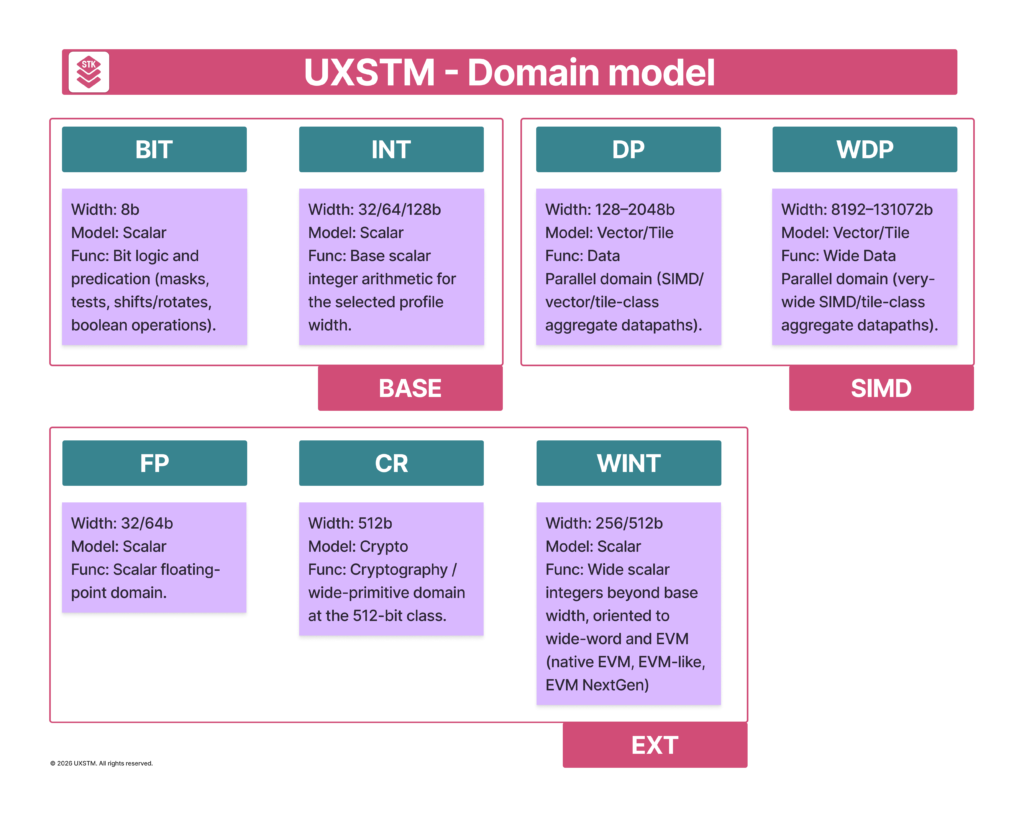 UXSTM is multi-domain. Each domain defines a typed execution surface and nominal width class: